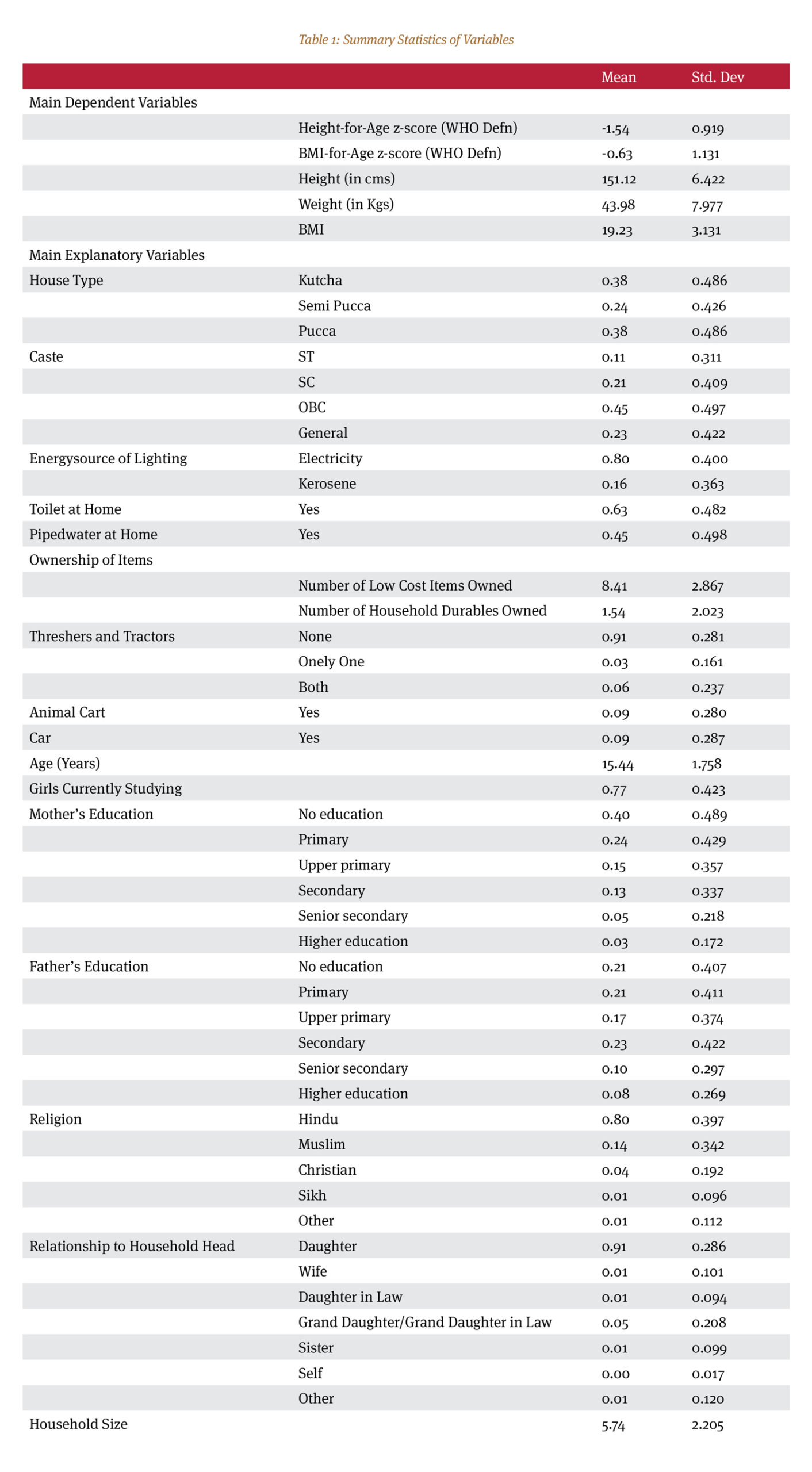 Table 1 presents the overall characteristics of our sample. The top portion of this table presents the descriptive statistics for our dependent variables (and the variables from which they are derived), and the bottom portion presents the same for explanatory variables used throughout the study. The average height-for-age z-score is -1.54. This means that, on an average, an adolescent girl in India is almost one and a half standard deviation shorter than their counterparts in the WHO reference group. This shorter average height can be an indicator of the differences in nutrition, genetics, and general living condition. The BMI-for-age difference between Indian adolescent girls and their international counterparts is not as much as that in the height variable. But still, in terms of BMI-for-age, Indian girls underachieve by more than half a standard deviation. Although, height-for-age z-score and BMI-for-age z-score are our main dependent variables, we carried out some additional analysis in terms of height (measured in cms.), weight (measured in kgs.), and BMI of the girls surveyed. The average height of the adolescent girls in India is computed to be just above 151 cms. and the average weight is approximately 44 kgs. The weight of the girls has a relatively large standard deviation of approximately eight kgs. (the coefficient of variation is much larger for weight compared to height – 18 percent and 4.25 percent, respectively). The average BMI is 19.23, which can be considered to be within the normal BMI range of 18.5-24.9, albeit on the lower side. However, a standard deviation of close to three indicates that on the lower side, many girls actually slide into the underweight group.