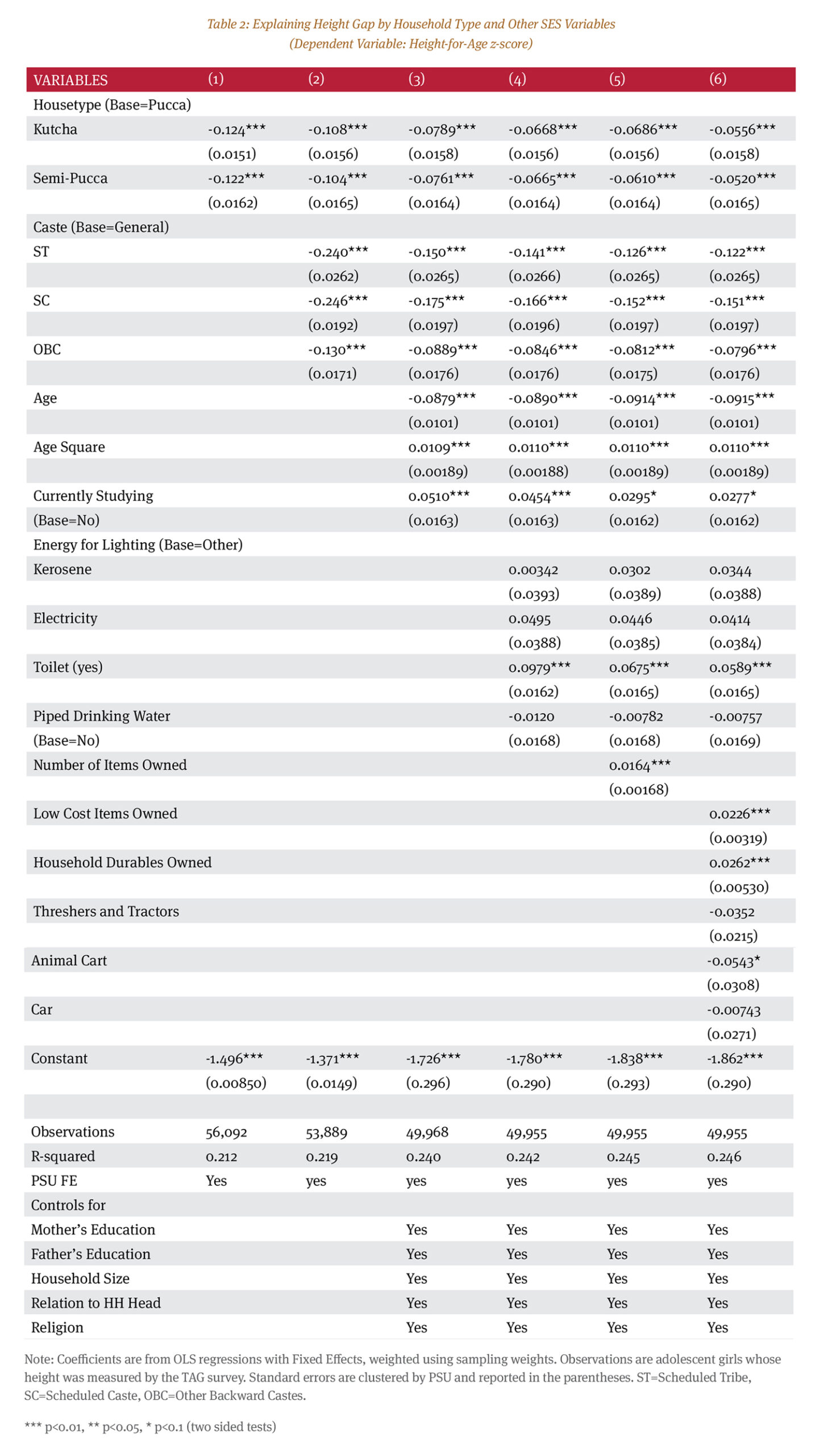 A significant proportion of existing research from India that has attempted to predict adolescent girls’ growth measures has focused on nutritional and household SES factors (some of which are included in this study). Most of such studies are either based on small sample (Macwana et al., 2017; Rohilla et al., 2014; Goel et al., 2013) or in a specific type of residence such as in rural areas (Coffey et al., 2019). Such study designs limit the generalisability of findings. Our study is a departure from the existing empirical findings; it uses a nationally representative data set, the TAG survey, to test the research hypotheses. Upon comparing simple bivariate cross-tabulations (e.g., caste and house type) from TAG and NFHS-4 data sets, we find some similarity. This provides additional validation regarding the quality of TAG survey data.