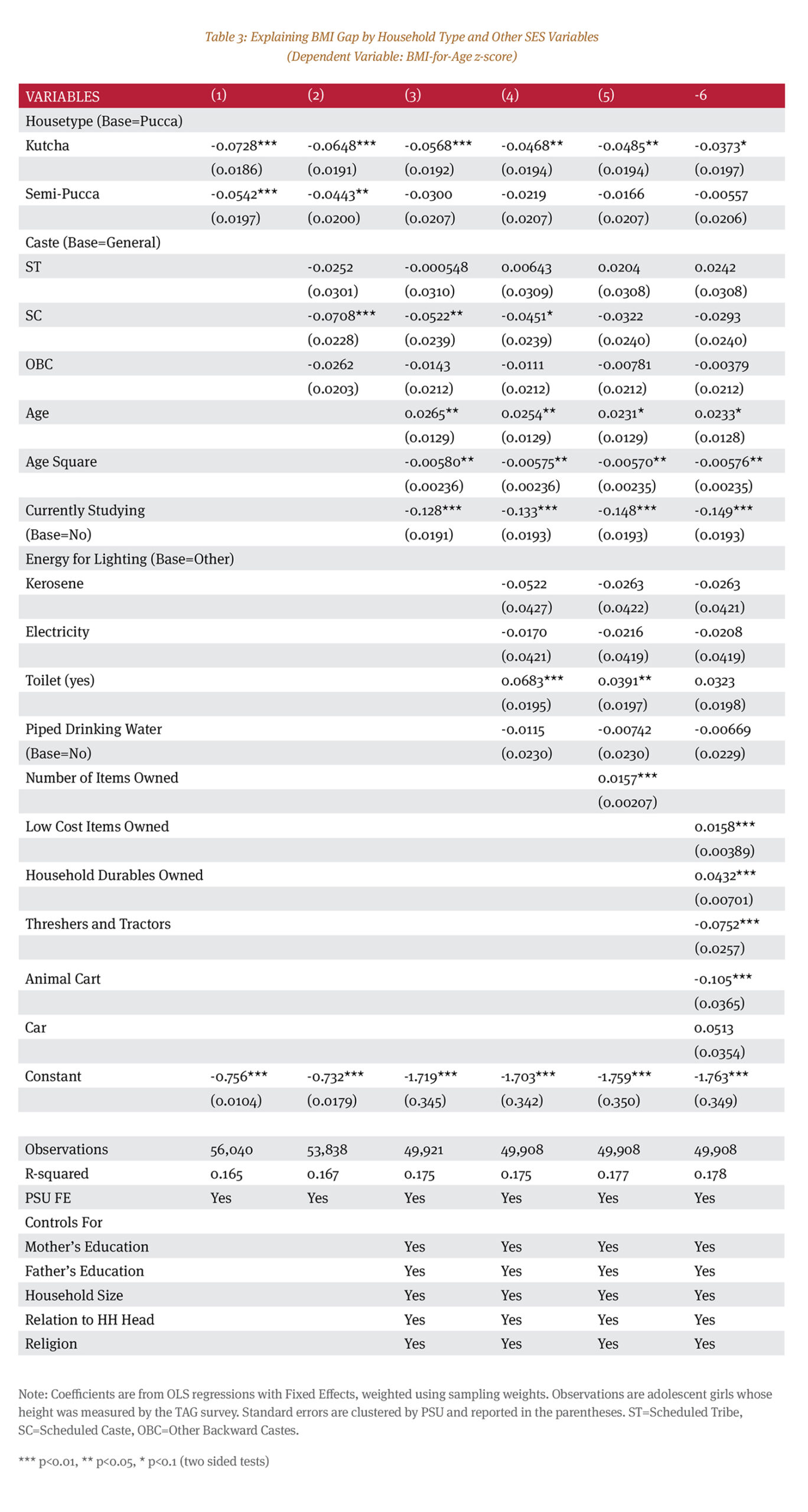 In columns 3, 4, 5, and 6, we progressively include demographic controls and different types of ownership variables. Source of lighting (kerosene lamp, electricity, or other types) and access to piped drinking water at home does not seem to affect either height-for-age or BMI-for- age z-scores – both in the models where we do not include any indicator of wealth (through item ownership) and models where we do. Girls who reported that they are currently studying have a positive and negative effect, respectively, on their height-for-age and BMI-for-age z-scores. However, availability of toilet affects health outcomes positively. When we include detailed controls for item ownership, this positive effect vanishes for BMI- for-age z-scores. Thus, to some extent, the availability of toilet is a proxy for wealth and economic condition of the household, which, when captured through other direct variables, loses its explanatory power at least for BMI-for- age z-scores. For both the dependent variables, ownership of household items has a positive effect on health outcomes. Ownership of these items indicates economic well-being and hence affects the health outcomes positively. The difference between columns 5 and 6 are in how we treat different types of household items vis-à-vis each other.