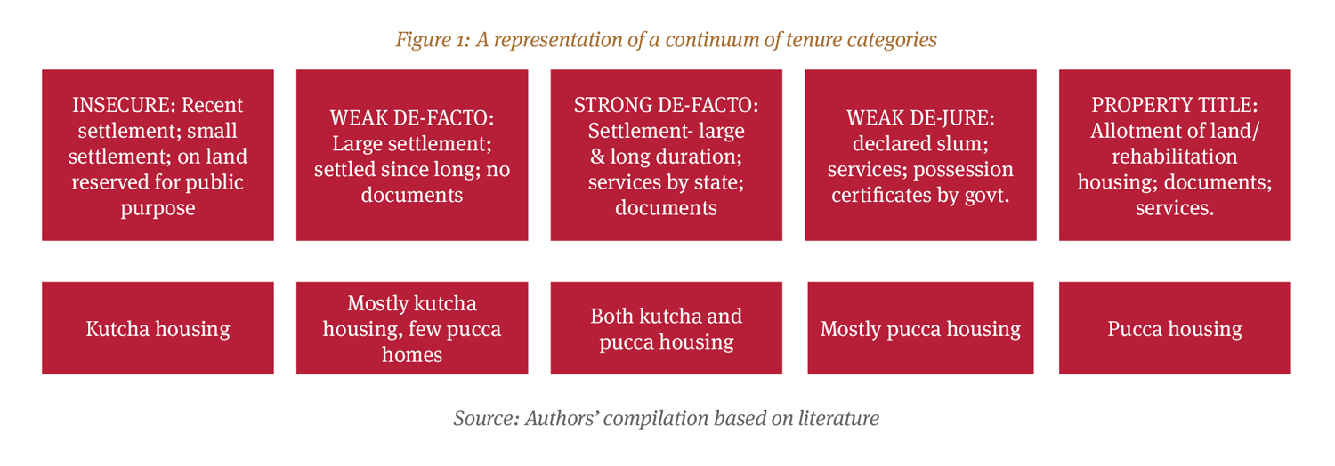 Tenure security is not solely determined by law, and therefore, notions of legal or illegal, formal or informal status, do not apply. It is ‘a relative concept and a matter of perception as well as law’ (Payne, Durrand- Lasserve, & Rakodi, 2009). The poor transition through different stages of tenure security from insecure tenure (with no rights whatsoever and a very high risk of forced eviction) to de-facto rights – i.e., rights in fact (with a perception of security) and finally, progress to achieve de-jure rights – i.e., legal rights of various types, including right to reside, possession certificates, allotment of homes and property titles. Slums and settlements are classified into notified or non-notified slums. Those living in non-notified slums live with insecure tenure, while notified slums enjoy a quasi-legal status, as they are recognised by the state and are also often supplied with public services. Those living in non-notified slums may begin with insecure tenure, but can transition to obtaining de-facto rights through long residence; bigger size of settlement which allows them to gain political support through vote banking; through access to welfare benefits (access to BPL/APL cards); access to public services and infrastructure from the state and/or access to voter identity cards or payment of property tax. Apart from the duration of residence and size of the settlement, the strength of de-facto tenure security also depends on how many people possess such documents in a given slum (Mahadevia, 2010). Access to services such as water, electricity, sanitation and toilets is perceived as an indication of the state’s acceptance of the continued existence of settlements, thus providing de-facto tenure (Paul Strassmann, 1984; Strassmann, 1980).
