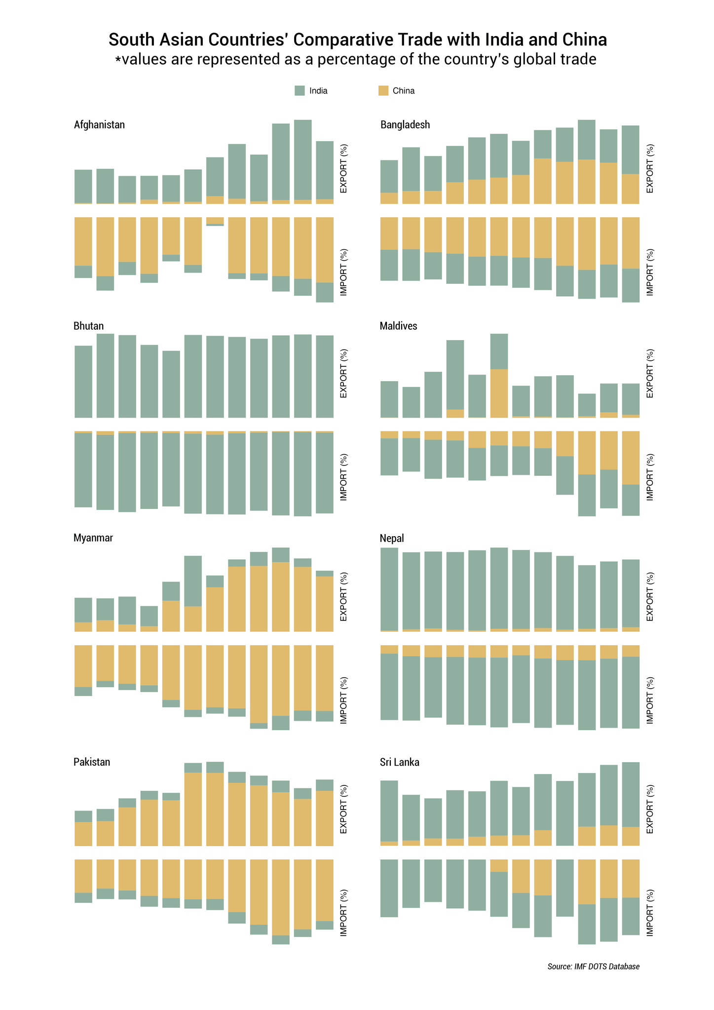 Only Afghanistan, Bhutan, and Nepal have a higher trade share with India compared to China