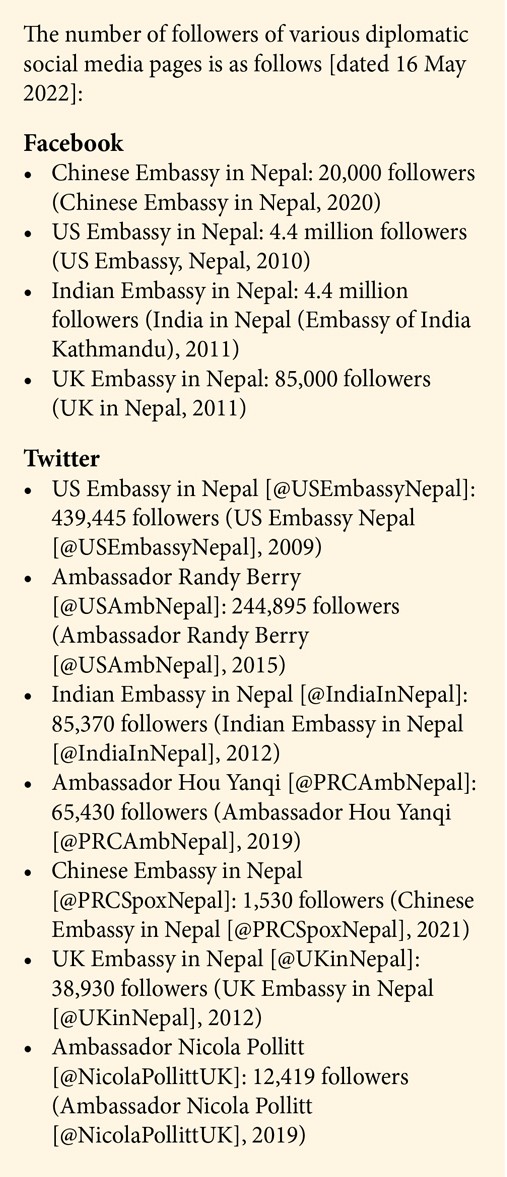 In recent years, Chinese foreign missions have become increasingly active on social media channels such as Facebook and Twitter, although both are not officially allowed in China. The Chinese Ministry of Foreign Affairs (@MFA_China) joined Twitter in October 2019 and Ambassador Hou Yanqi joined in June 2019 (@PRCAmbNepal). The mission in Nepal joined Twitter in December 2021 (@PRCSpoxNepal). An Associated Press investigation revealed that “Chinese diplomatic accounts have more than tripled on Twitter and more than doubled on Facebook since mid-2019” (Kinetz, 2021).