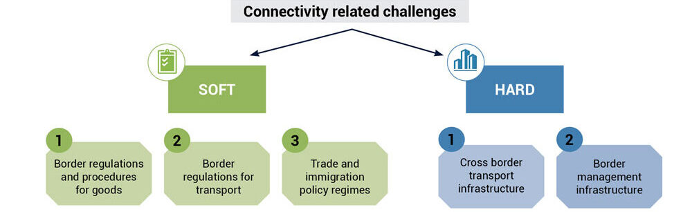 Regional integration in the BBIN sub-region has been held hostage by connectivity-related barriers. The BBIN sub-region is a part of the larger geography that I would like to call Southern Asia, including the BBIN and all of mainland South-East Asia (i.e., Myanmar, Thailand, Cambodia, Vietnam, Laos, Peninsular Malaysia, and Singapore). Such connectivity-related barriers can be broadly categorised under hard infrastructure-related issues and soft policy and procedural issues. More specifically, they can be summarised under five distinct categories as represented in Figure 1.