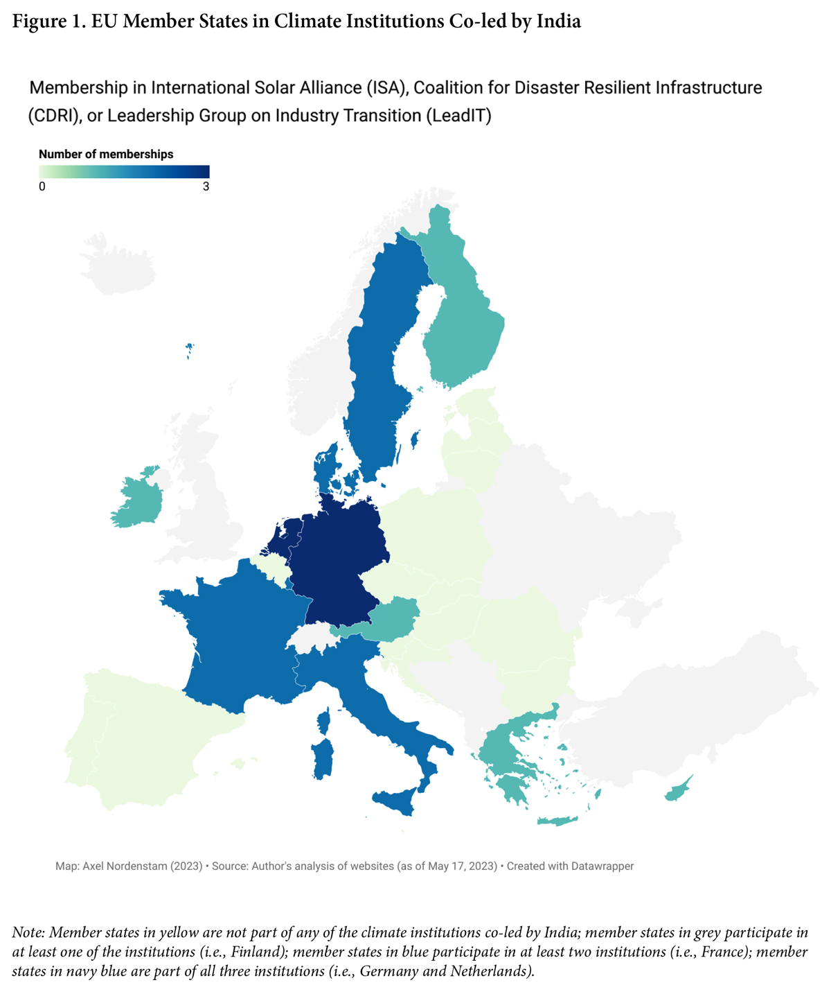 Figure 1 shows the EU member states who are part of the three climate institutions co-led by India, based on calculations by the author.