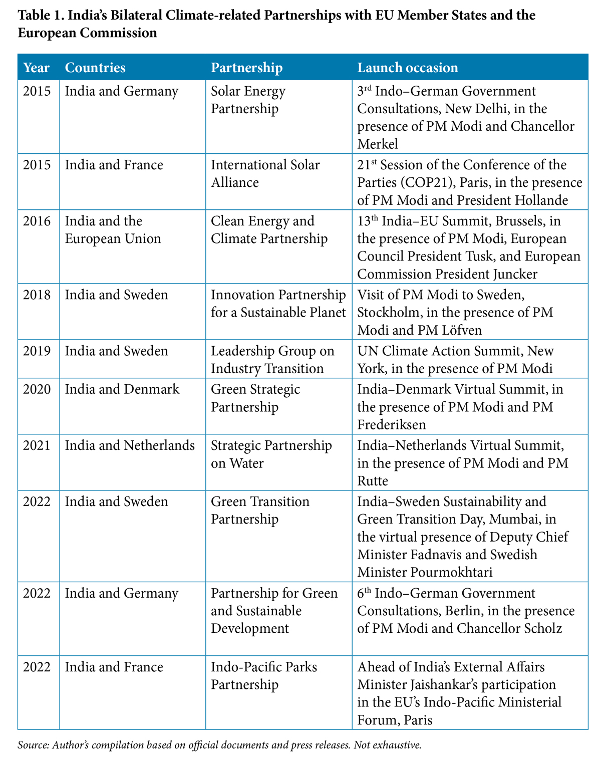 A few of the partnerships that India has chosen to formalise are quite attractive. For instance, the ISA that India co-chairs with France has evolved into a treaty-based institution after its inception in 2015. The Leadership Group on Industry Transition that India co-chairs with Sweden continuously attracts new members, including the United States in 2021 and Tata Steel in 2023. In September 2020, India entered into a Green Strategic Partnership with Denmark. A year later, India signed the Strategic Partnership on Water with the Netherlands. However, the list of climate-related partnerships that India has entered goes beyond these novel partnerships (see Table 1).