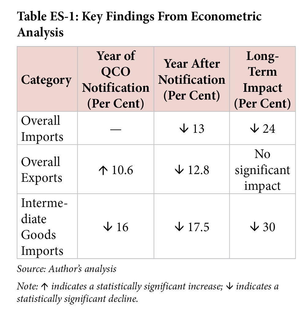 An econometric exercise was undertaken to understand the causal impact of QCOs on India’s trade flows, and the key findings are highlighted below.