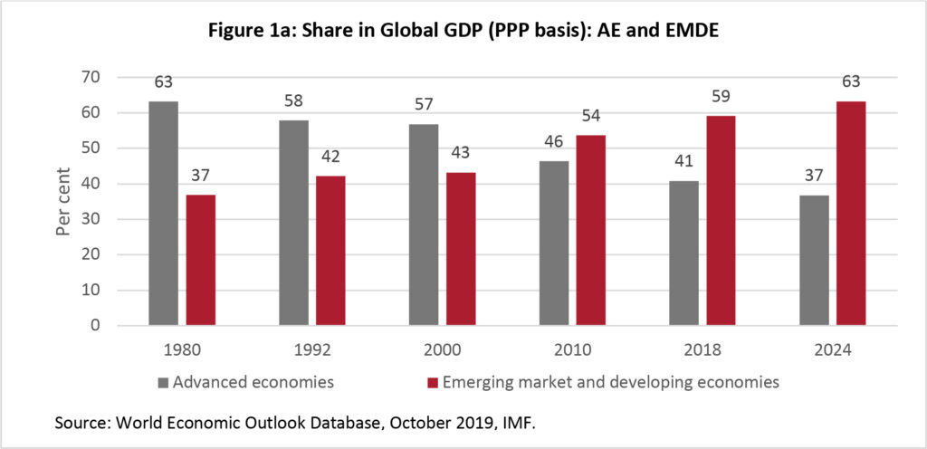 The global economic structure was broadly stable from 1945 until the turn of the millennium. The advanced economies’ (AEs) share in global GDP was around 60 percent (on PPP basis) through that period though there were changes in relative weights among the advanced economies themselves, particularly related to the postwar rise of Germany and Japan. Change has gathered pace since 2000, with economic weight shifting from the North Atlantic to Asia. This is expected to accelerate further over the next couple of decades. So, changes in global economic governance will have to be more substantive than the current incremental change envisaged.