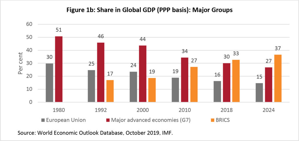 Until recently, there was a great deal of cooperation among the EDEs led by the BRICS countries on issues of global economic governance. With the economies of Russia, Brazil and South Africa slowing in recent years, their voice in international discussions has diminished. Although the Indian economy continued relatively high growth until 2018, it has also shown signs of a slowdown that could extend to the medium-term. With the recent border conflict between India and China on the one hand, and increasing US-Russia tensions on the other, the role of BRICS as a relatively credible pressure group for governance reforms in the IMF and otherwise has also diminished. Within Asia, India’s reluctance to join the RCEP[9] trade agreement also reduces the possibilities of active cooperation among Asian countries.