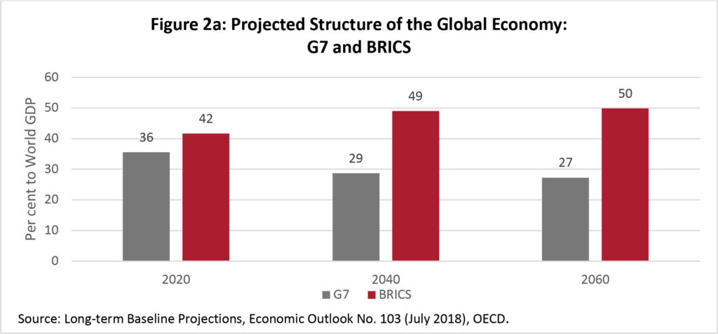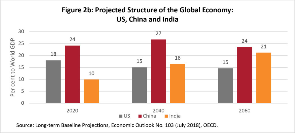 This constitutes a remarkable transformation in the structure of the global economy in a very short period of historical time. Such a pace of change is probably unprecedented in human economic history. It is no surprise then that the existing global economic power and governance structure is finding it difficult to cope with this phenomenal change. “The intimate links between the rise and fall of great powers and the international monetary and financial system is what makes studying the latter so fascinating” (Gourinchas and others, 2019). The last time that such a change took place was at the beginning of the 20th century. Britain was the leader of the world economic system until around World War I and British pound sterling was the operative global currency as the US dollar is now. It took almost 30 years, till the end of World War II, when the United States clearly took over leadership of the global economic system and currency (Kindleberger and Aliber, 2005). This change in the prevailing hegemon was anything but orderly and did not take place quickly. As China’s economy continues to gain in size relative to the United States in the coming years, and possibly even surpasses it (at market exchange rates) within the coming decade, the challenges facing global economic governance will intensify greatly (Figure 2).