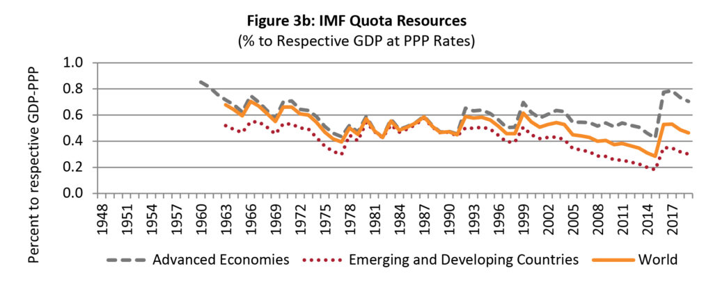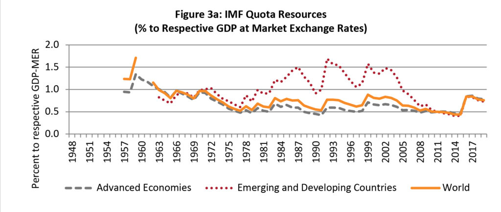 At present, the total quota resources of the IMF amount to SDR 477 billion (US $ 651 billion), which are supplemented by NAB of SDR 182 billion (US $ 249 billion) and BBA of SDR 318 billion (US $ 434 billion). The NAB resources are slated to double SDR 365 billion (US $ 500 billion) by the end of 2020.  There has also been agreement on the framework to begin a new round of bilateral borrowing which will become effective at the beginning of 2021.[21] Thus, quota resources will soon amount to less than half of total IMF resources. The availability of such large borrowed resources through generous contributions of the membership demonstrates that the need for adequately resourced IMF is recognised by its larger members. It, therefore, serves to provide a degree of perceived stability to the IMS along with a certain degree of complacency regard to availability of liquidity if needed. On the other hand, however, such availability of resources reduces the pressure for enhancement of permanent quota resources and, consequently, the reapportionment of quotas and associated changes in voice and representation that would otherwise accrue to the fast-growing emerging market countries, particularly China.