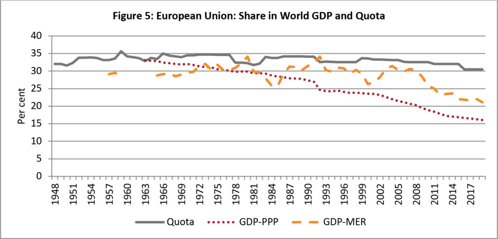 For it to regain credibility and effectiveness, the IMFs governance structure clearly has to become more inclusive. The US needs to retain its leadership role, in its own as well as in the wider international interest. European countries remain overweight, with the ‘advanced Europe’ group (European Union, Norway and Switzerland) taking a third of board seats, and more than a third of board voting power. The relative constancy of their quota shares is striking, since their share in GDP has been falling consistently (Figure 5). The European Union share (including the UK) of global GDP is now just over 16 percent (PPP basis) or 21 percent (MER basis). The key governance change in the IMF will therefore involve a significant reduction of the quotas of European countries and associated reduction in the seats that they occupy in the IMF board, along with a corresponding increase in the share of EDEs and of the United States.
