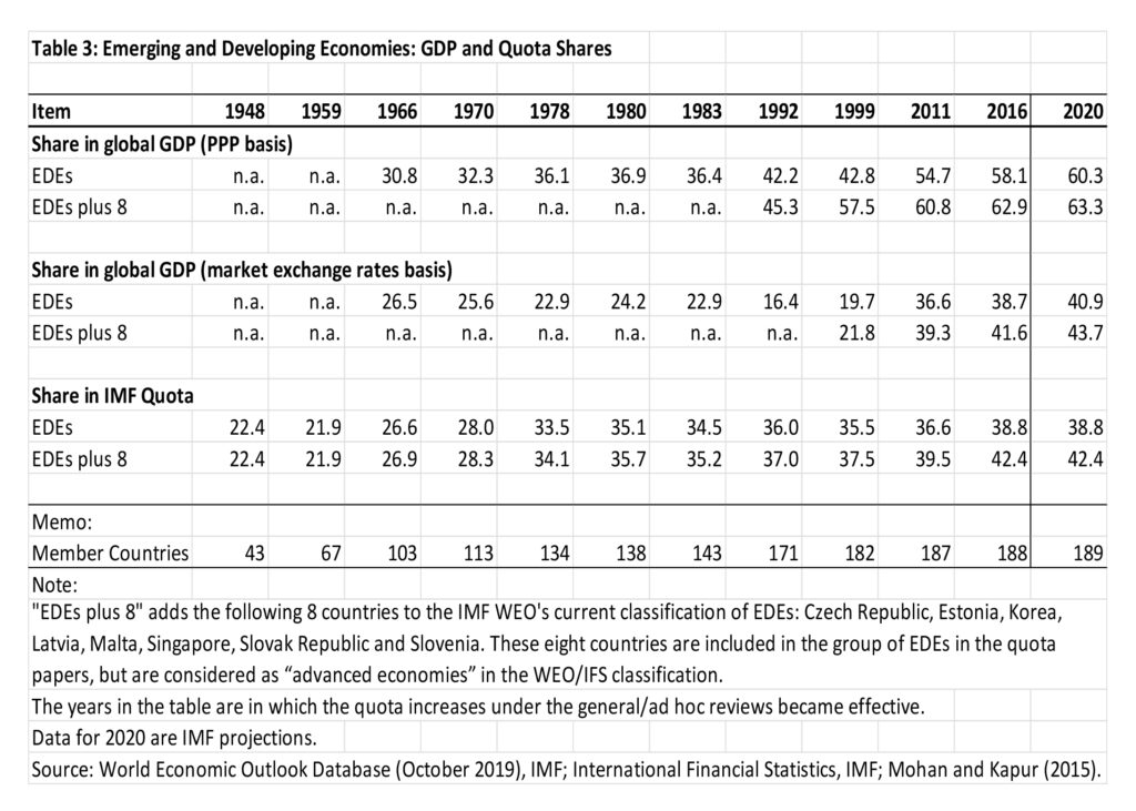 Until the 1980s the pace of change in the distribution of global GDP was relatively slow as between AEs and EDEs, and their share in IMF quotas was broadly consistent with their GDP shares. This is despite the Asian economic miracle which started in the 1970s and gathered pace in the 1980s and beyond, since the initial economic weight of these countries was small.  There was little palpable change in the EDEs overall economic weight in the world, increasing from around 30 percent in the mid-1960s to just over 40 percent by 2000 in terms of global GDP (PPP basis), with the 1990s increase being partially accounted for by the addition of all the former socialist countries IMF’s membership.[22]  It is in the 1990s, and accelerating after 2000, that their share in global GDP began to increase whereas their quota share did not keep pace accordingly. There has been a dramatic increase in their share of global GDP since 2000 from just over 40 percent to about 60 percent now in PPP terms, and a doubling from about 20 percent in 2000 to about 40 percent in MER terms. Over the same period the EDE share in IMF quotas has remained relatively stagnant increasing from around 35 percent in 2000 to just 39 percent now, even after the 14th review which was finally implemented in 2016 (Table 3). The underrepresentation of EDEs in IMF quota distribution and hence in governance is therefore becoming more and more stark by the day.