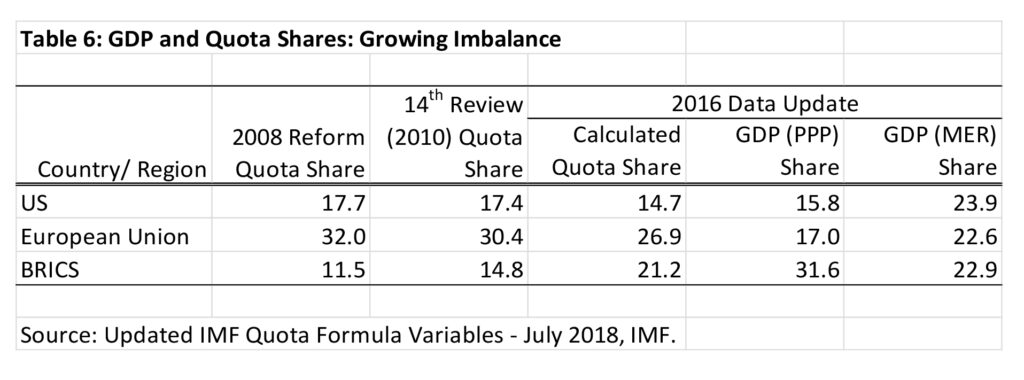 The problem of further reform of governance in the IMF has now been compounded by the standstill agreed to in the 15th review completed in 2019.[23] First, as a consequence of the unprecedented delay in implementation of the 14th review until 2016, the 15th review, could not be conducted in 2015 as it should have been according to the five-year review schedule: it was finally concluded in 2019. Second, the 16th Review should in fact have been completed this year in 2020: it is now scheduled to be conducted in 2023. It is then unlikely for an agreement on the 16th Review to be reached before 2025 and, going by past patterns, for implementation to take place much before 2027.[24] The quota distribution resulting from the 14th Review was based on 2008 economic data will therefore stand until around 2027. By then it will be out of date by almost 20 years, thereby accentuating the governance imbalance immensely.