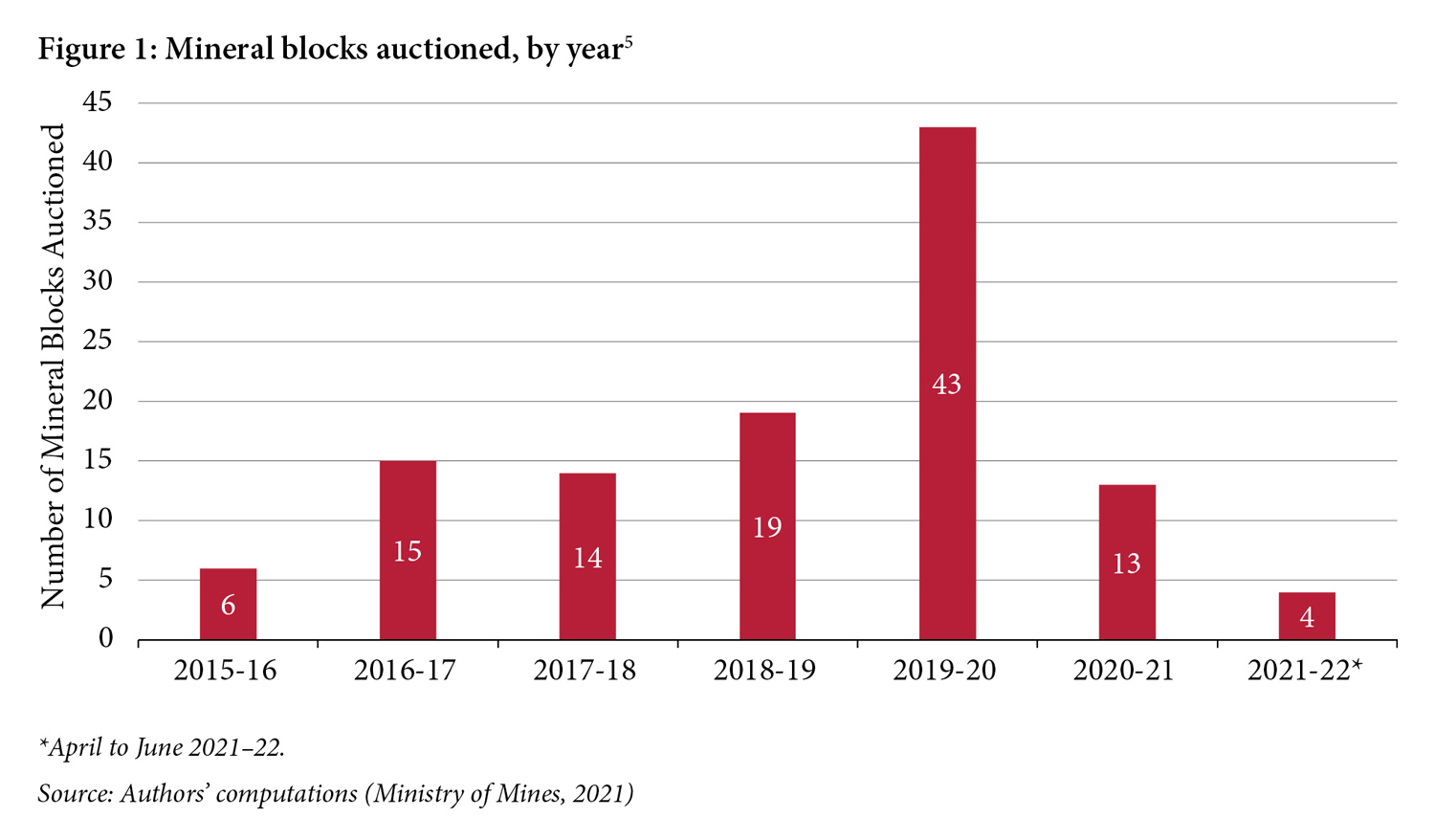 Figure 1 shows the number of auctions each year following the amendment of the Act in 2015. The first year saw just six auctions but this number more than doubled over the next two years, to 15 and 14 respectively. The years 2018–19 and 2019–20 saw a surge in auctions (mainly of brownfield mines, i.e., already mined blocks, unlike ‘greenfield’ mines that have never been mined). This surge was triggered by a provision in the amended Act, which stated that leases of certain merchant mines would lapse on March 31, 2020 for specific reasons as mentioned in MMDR Act, 2015.