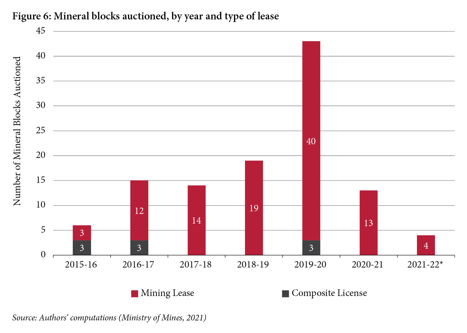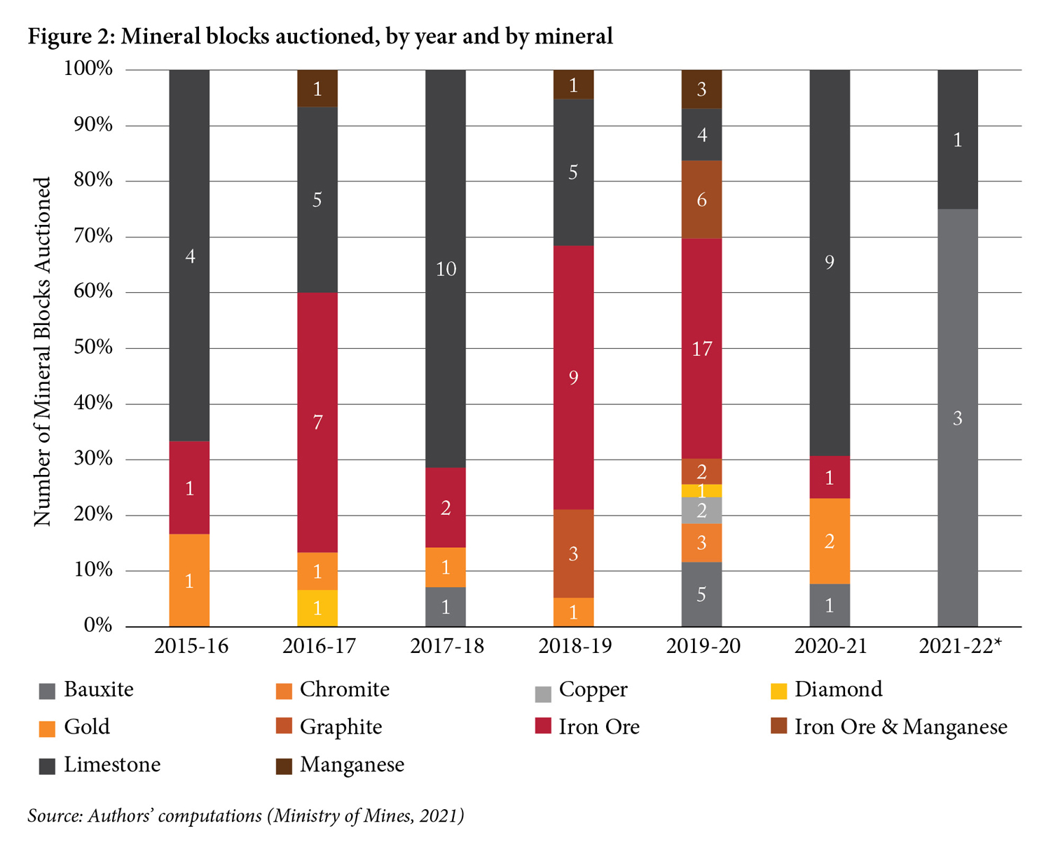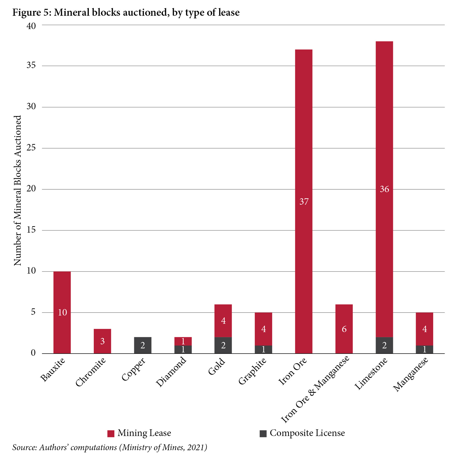 The majority of blocks auctioned were iron ore (and some iron ore and manganese) and limestone blocks, which in total make up 81 of the 114 total auctions (Figure 5). In comparison, there were far fewer auctions of blocks with deep-seated minerals.