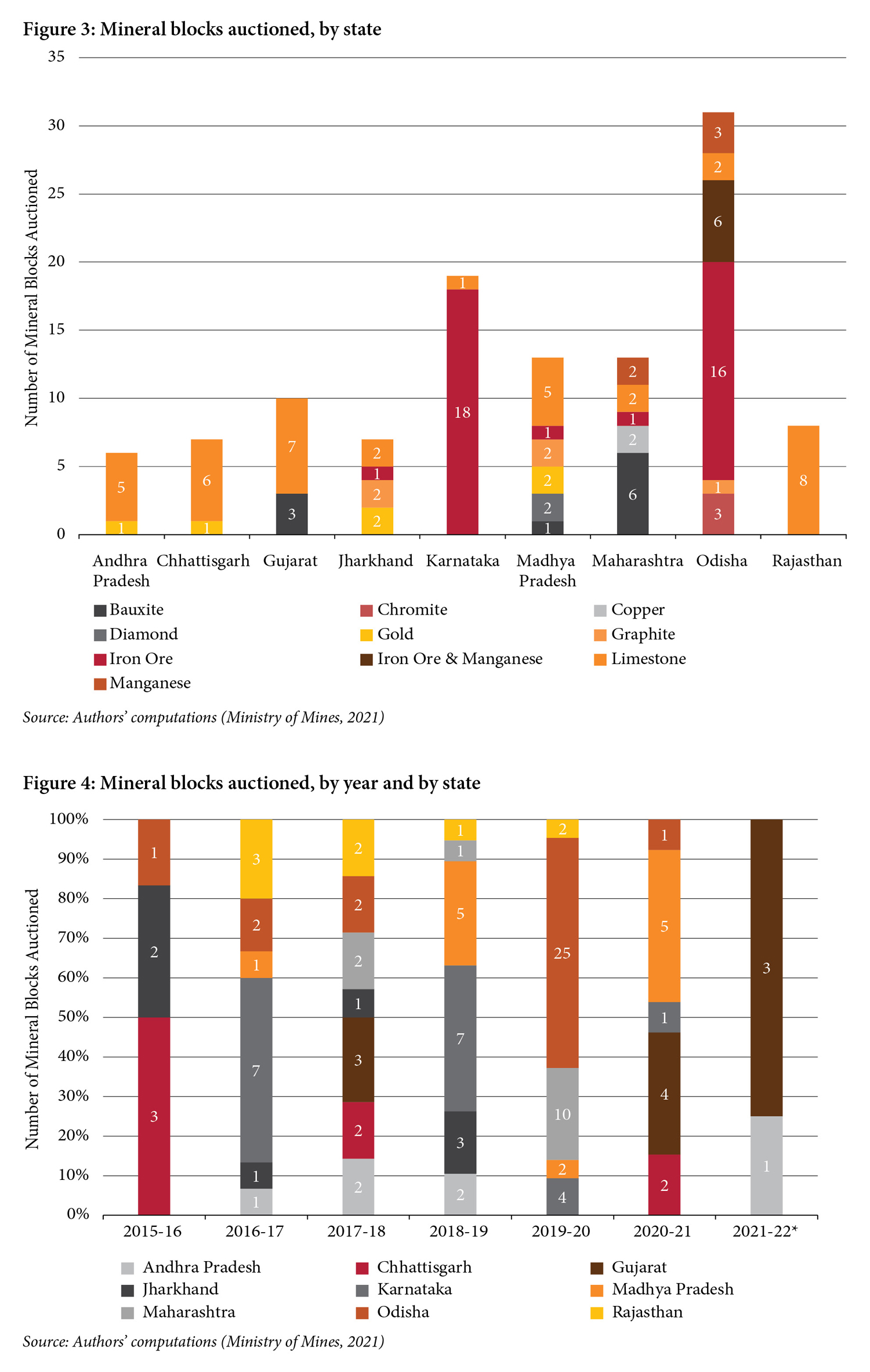 A total of 19 auctions have been held in Karnataka, 18 of which were previously operational iron-ore mines. Odisha saw a surge in auctions in 2019–20, with 25 blocks auctioned, of the total 31 in the state. The remaining seven states had fewer than 15 auctions each, primarily for limestone blocks (Figures 3 and 4).