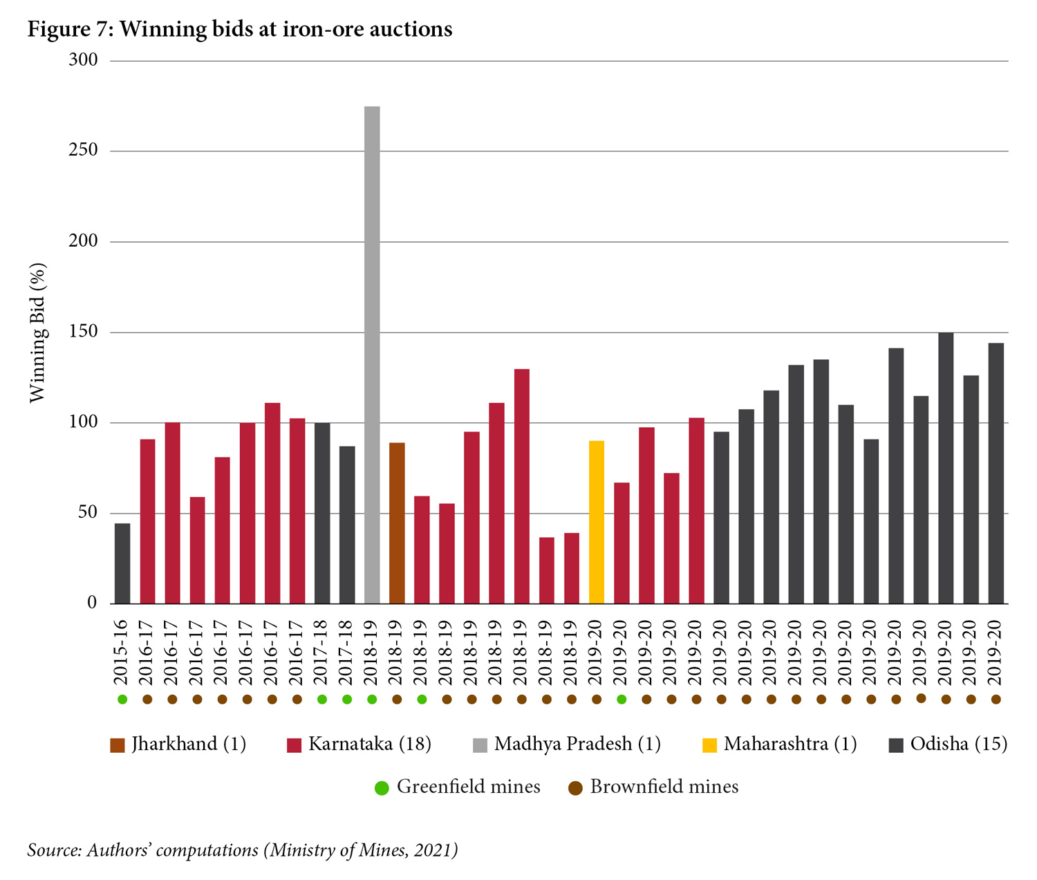 The auctions of iron ore blocks can be split into two components: brownfield mines and greenfield mines. Of the 36 iron ore mines auctioned, 31 were brownfield, and the remaining five were greenfield. While only a few greenfield mines were auctioned, it is notable that the average winning bid for brownfield mines (107 percent) was higher than the average for greenfield mines (70 percent), as is shown in Table 1. Figures 7 and 8 show the mines auctioned (green circles represent greenfield mines and brown circles represent brownfield mines).