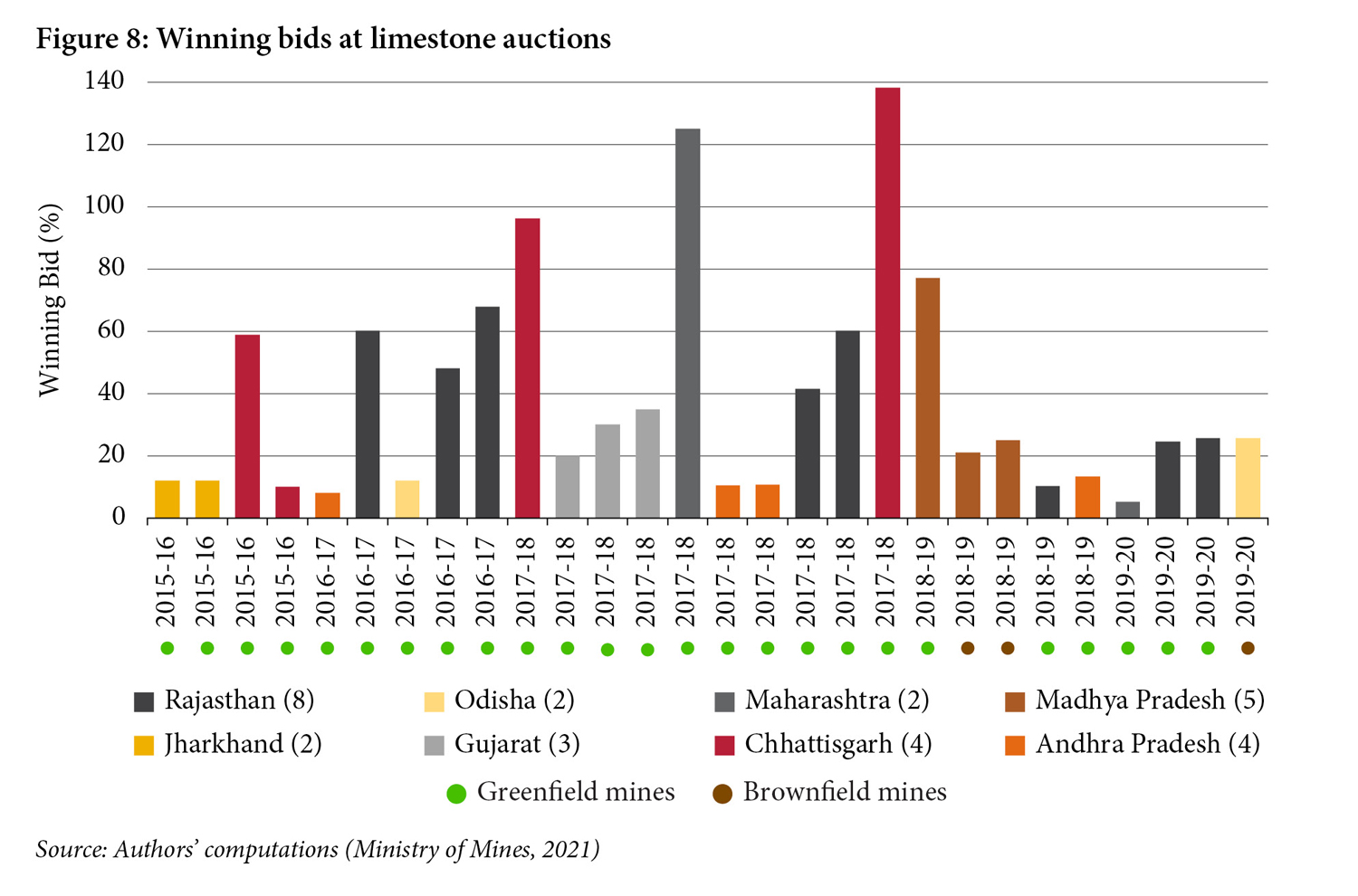 In contrast to the iron ore auctions, Figure 8 shows that greenfield blocks dominated limestone auctions—25 of the 28 mines were greenfield. With these auctions, the average bid for greenfield blocks was 47 percent, higher than the 26 percent average for brownfield blocks. As opposed to iron-ore blocks, the bids for the greenfield limestone mines were higher on average than for brownfield mines, though only a few brownfield mines were auctioned.