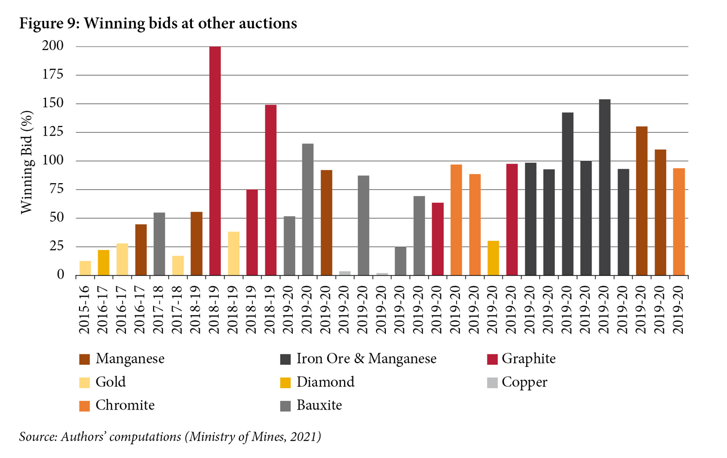 The analysis in this paper provides an overview of bids made in the auctions of iron ore, limestone, iron ore & manganese, bauxite, manganese, graphite, gold, chromite, copper, and diamond, with a focus on iron ore and limestone.