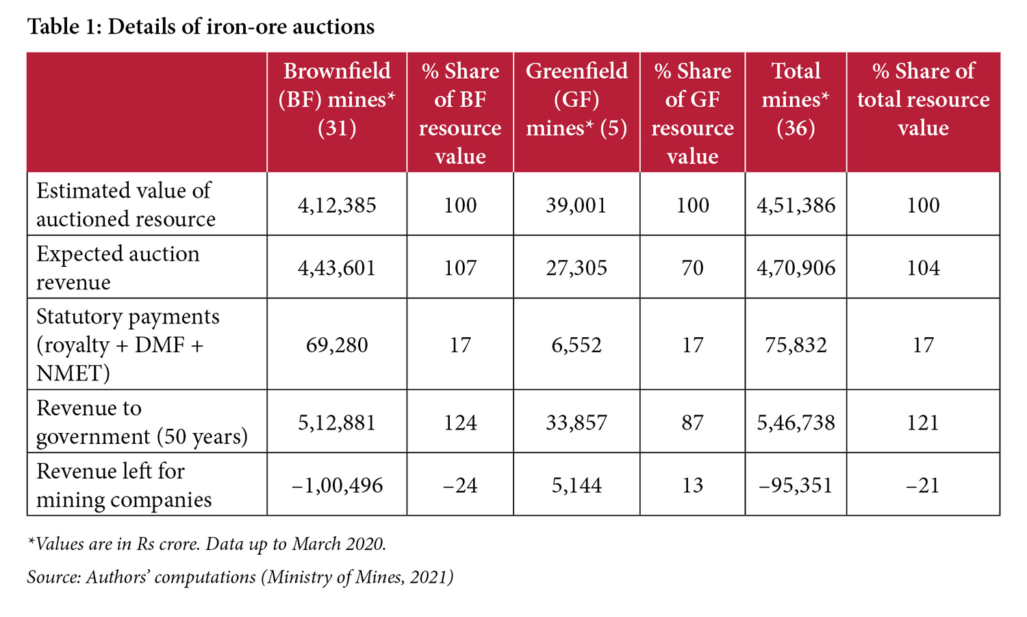 For the 97 mines auctioned, the miners will, on average, pay the respective State governments 102.9 percent of the value of minerals. This is primarily due to the large winning bids for the 42 auctions of iron-ore and iron-ore and manganese blocks. These bids consistently exceeded 50 percent and in 22 auctions exceeded 100 percent.
