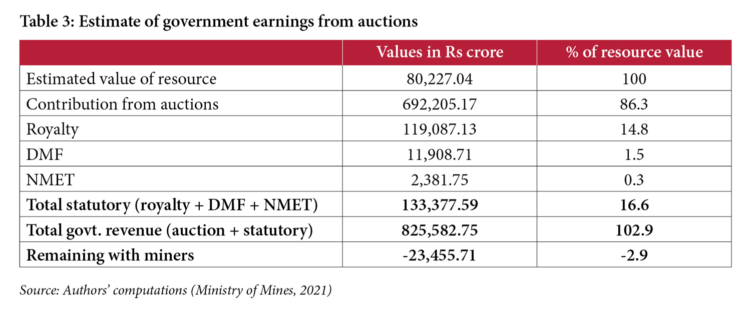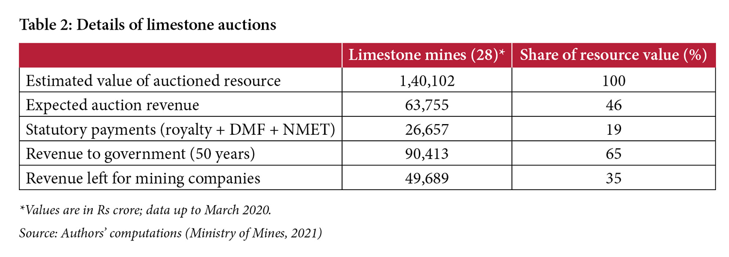 Using the results of the auctions and exploration data on the estimated quantity of mineral resources, the Ministry of Mines makes some implicit assumptions to calculate how much State governments can expect to earn over the lifetime of the mines. The auctions show that winning bids have been excessively high, leaving very little for the companies. Tables 1 and 2 show estimated earnings from iron ore and limestone auctions respectively, while Table 3 reflects the overall earnings of State governments from all auctioned mines. The assumptions made in computing this estimate apply to all tables: